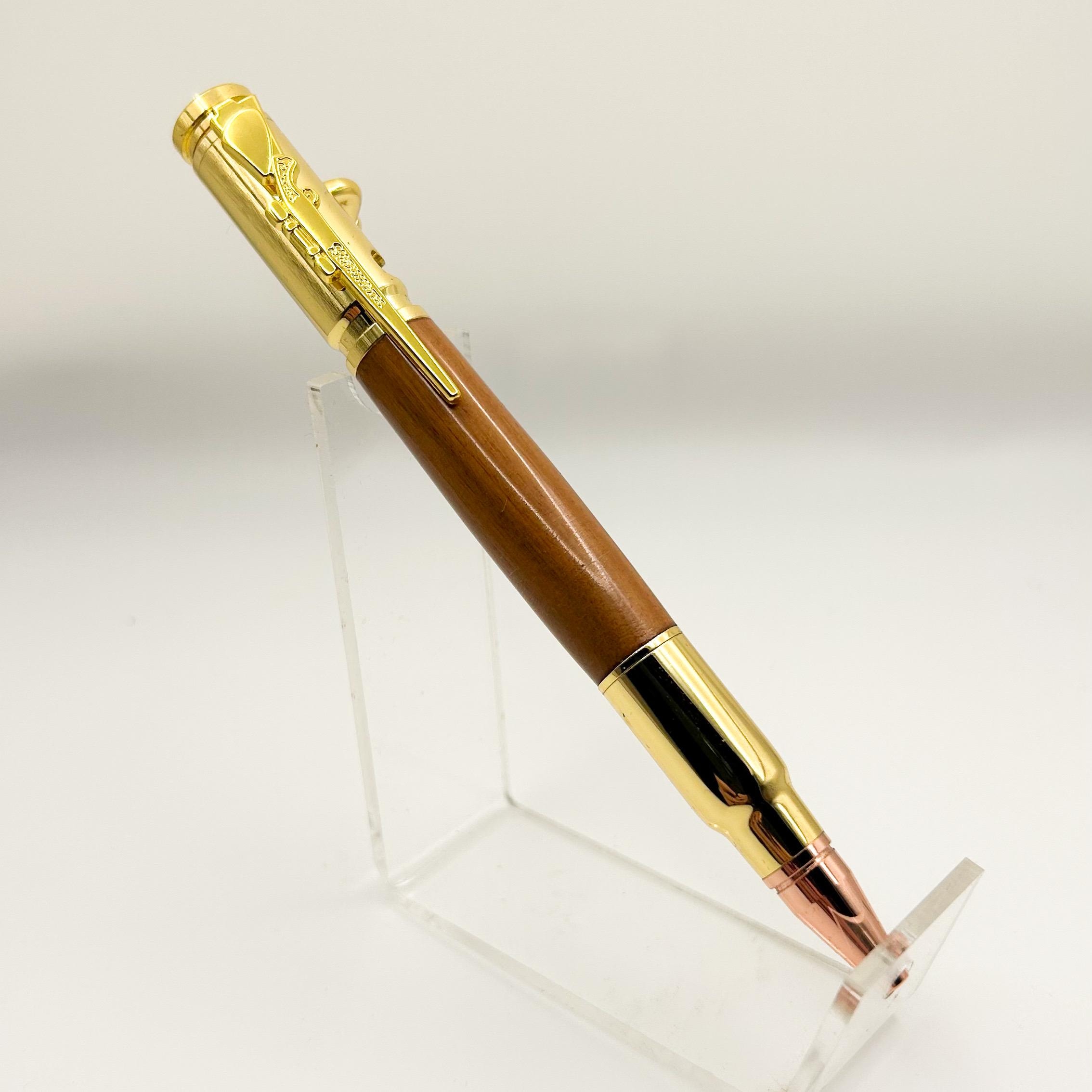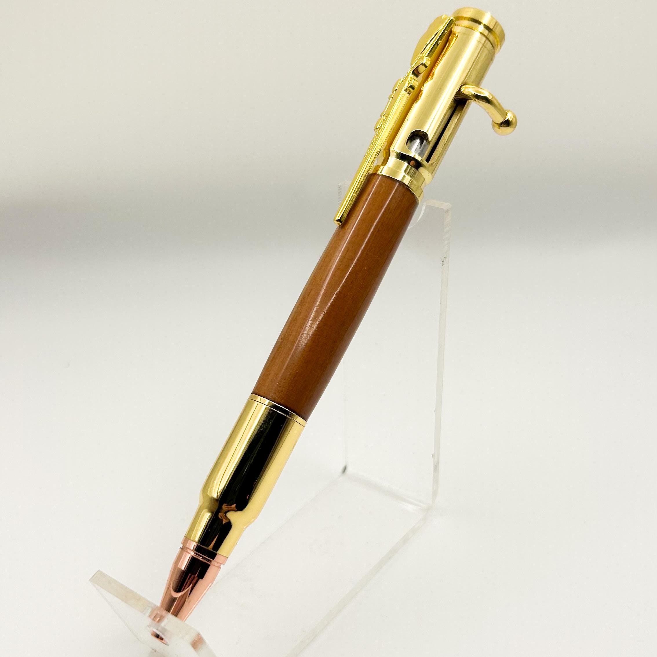 The smooth bolt-action mechanism delivers a satisfying, rifle-style click, paired with sleek gold-finished hardware that adds a refined contrast to the rugged character of the wood. Each pen is individually turned on the lathe, ensuring no two are ever exactly alike.