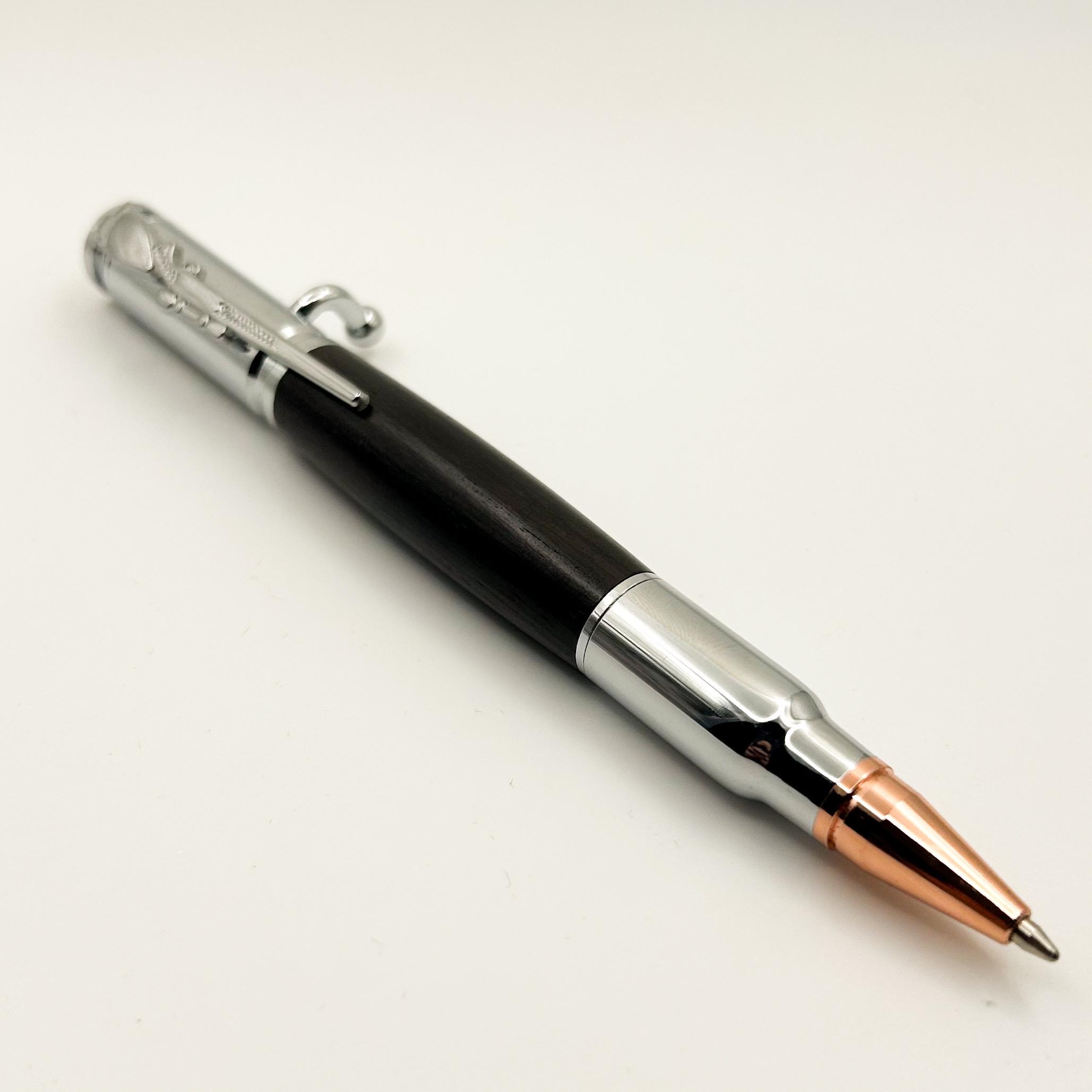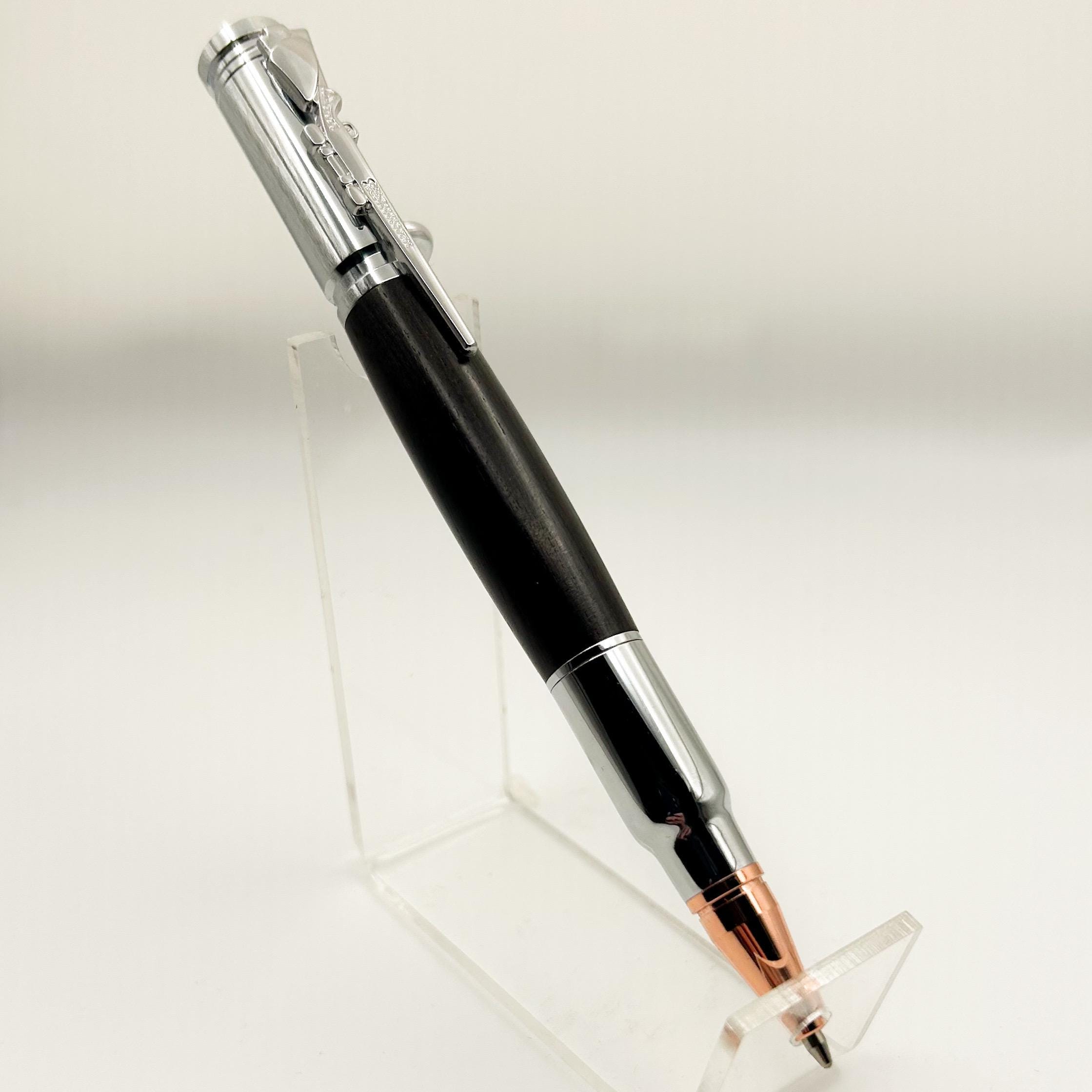 The smooth bolt-action mechanism offers a satisfying, rifle-style motion, paired with sleek chrome-finished hardware for a clean, modern contrast against the rich wood. Each pen is individually turned on the lathe, ensuring a truly one-of-a-kind piece of functional art.