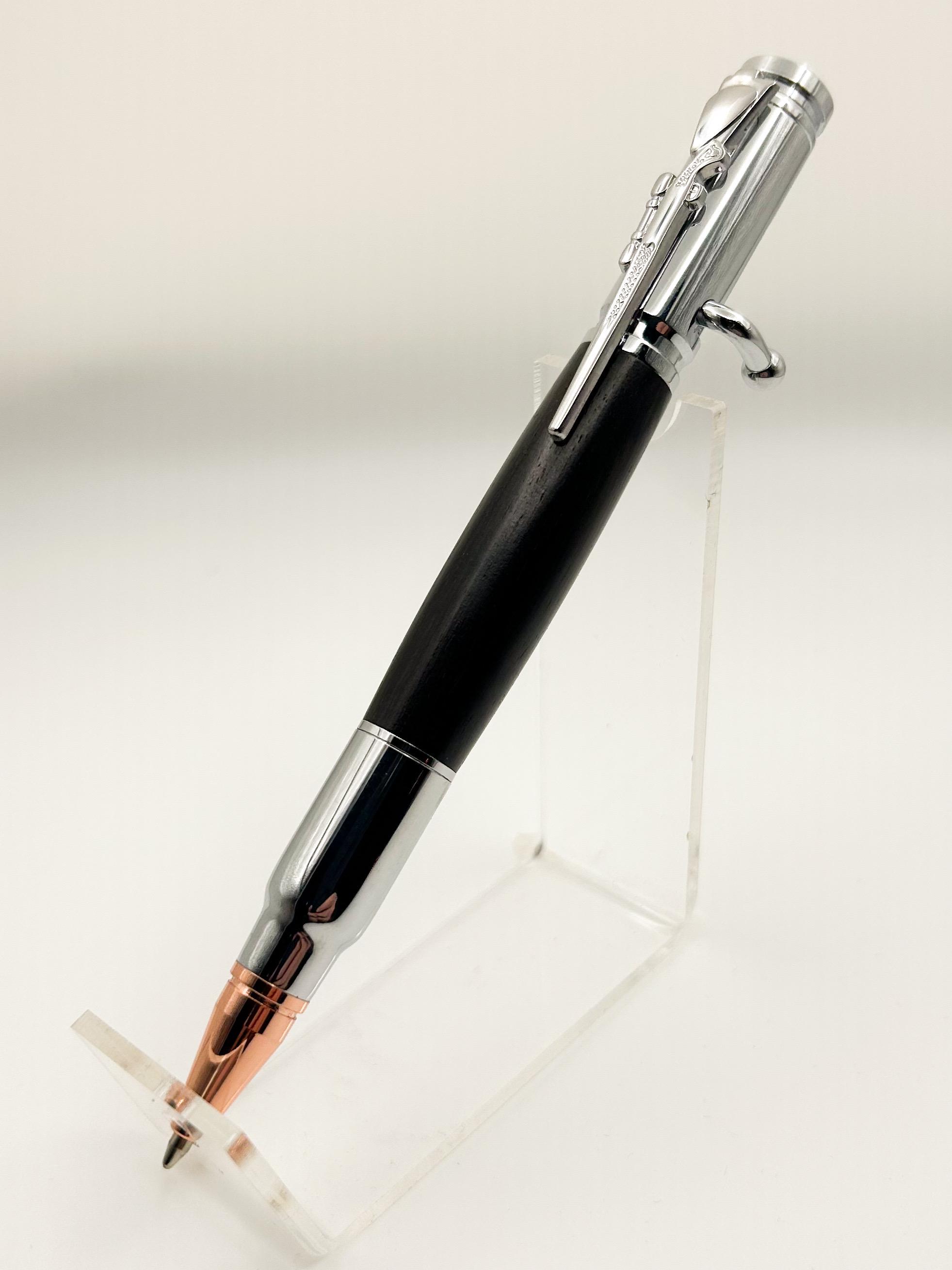 This handcrafted bolt-action pen is turned from African Blackwood, one of the densest and most prized hardwoods in the world. Known for its deep, dark tones and exceptionally fine grain, African Blackwood is often used in high-end musical instruments and heirloom pieces—making it an outstanding choice for a premium writing instrument.